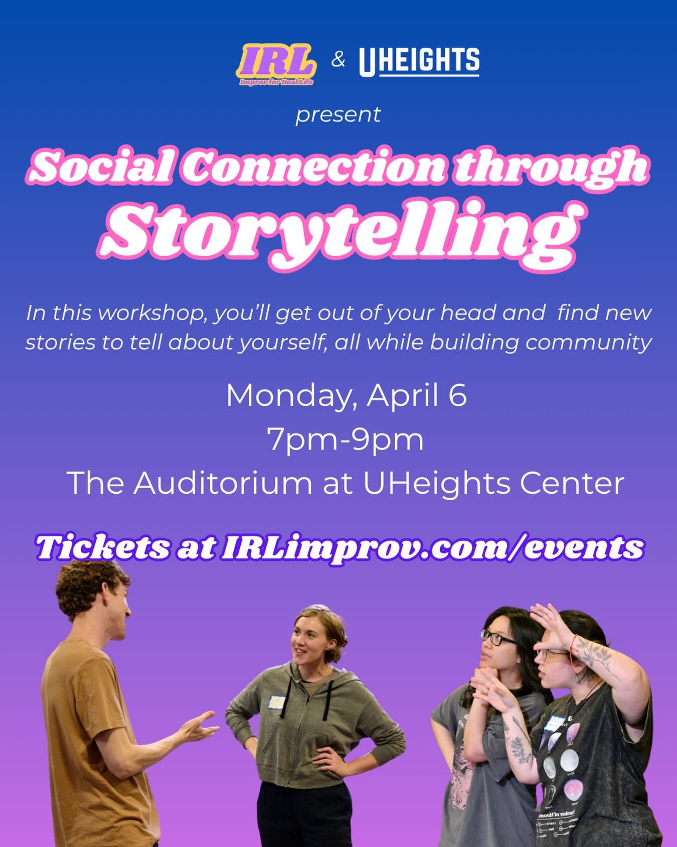 Rather than having the same surface-level conversations over and over, Improv for Real Life is a facilitated experience rooted in improv and personal storytelling, designed to help you turn neighbors into friends.